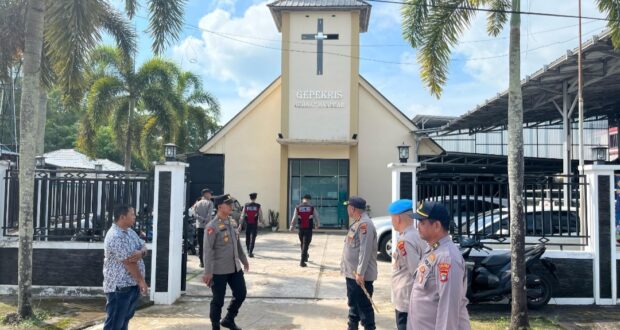 Polres Belitung Timur-Hubungan Masyarakat, Manggar. Kapolres Belitung Timur AKBP Indra Feri Dalimunthe, S.H., S.I.K., M.H. didampingi Kabag Ops Polres Belitung Timur, Kasat Binmas Polres Belitung Timur, dan Kasi Propam Polres Belitung Timur turun langsung cek pengamanan Ibadah Paskah di gereja-gereja di Kab. Belitung Timur, Minggu(20/04/2025).